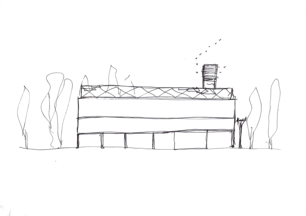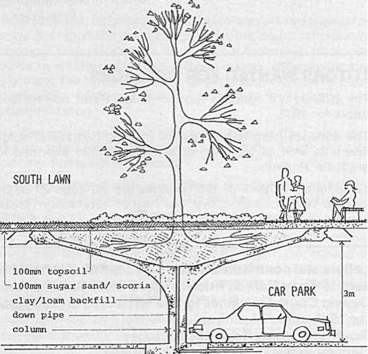 As seen from this diagram the lower section of the design is the car park but within the arches of the columns trees are being planted. My design is all about biodiversity so I will take this idea forward in my design. The seed bank and other spaces in my project have rewilding zones on the roofs with trees growing. The seed bank especially, I want to have elm trees growing on top of so that white-letter hairstreak butterflies have more habitats. This precedent is helping to reinforce this as it gives a strategy so that the trees are able to grow to full size as the roots have space to grow.