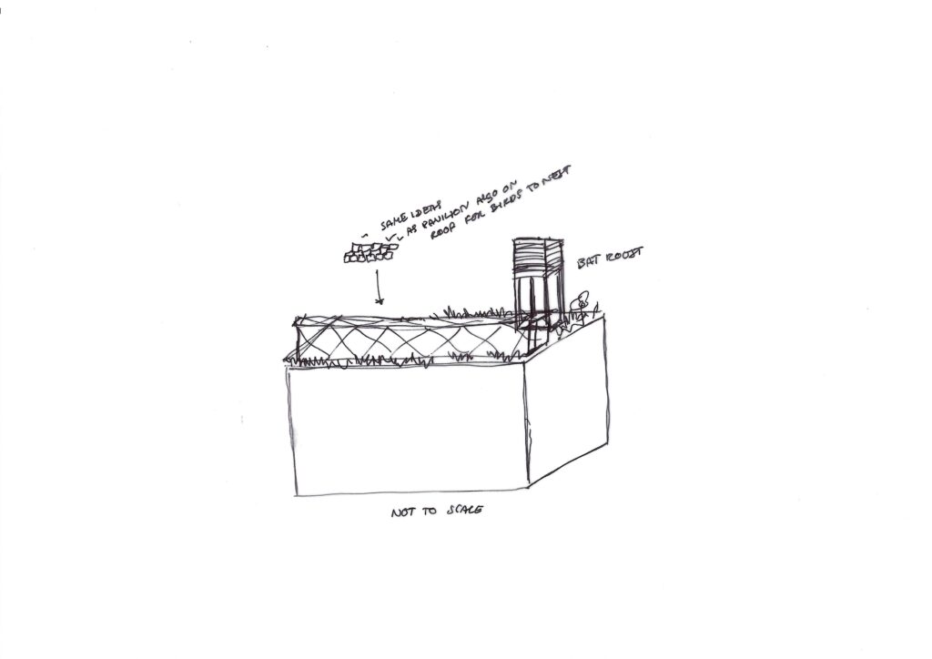 For my design at the start I wanted to have space which would be creating roost space for bats however the idea wasn’t structured very clearly and fully sheltered away acting as the roof and architecture. Instead I decided I wanted to change this to have its own architectural personality different to the rest of the building. Basically I wanted to create a new city space/ecosystem on the roof.